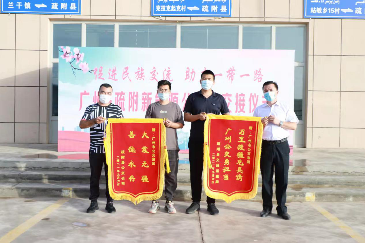9月6日下午,正式將車輛交付喀什,疏附縣交通運輸局為廣州公交集團送來“萬里援疆見真情,廣州公交勇擔當”的錦旗,疏附縣公交公司為廣州公交集團送來“大愛無疆,善德永存”的錦旗,圓滿完成了20臺援疆愛心車輛的交接儀式。