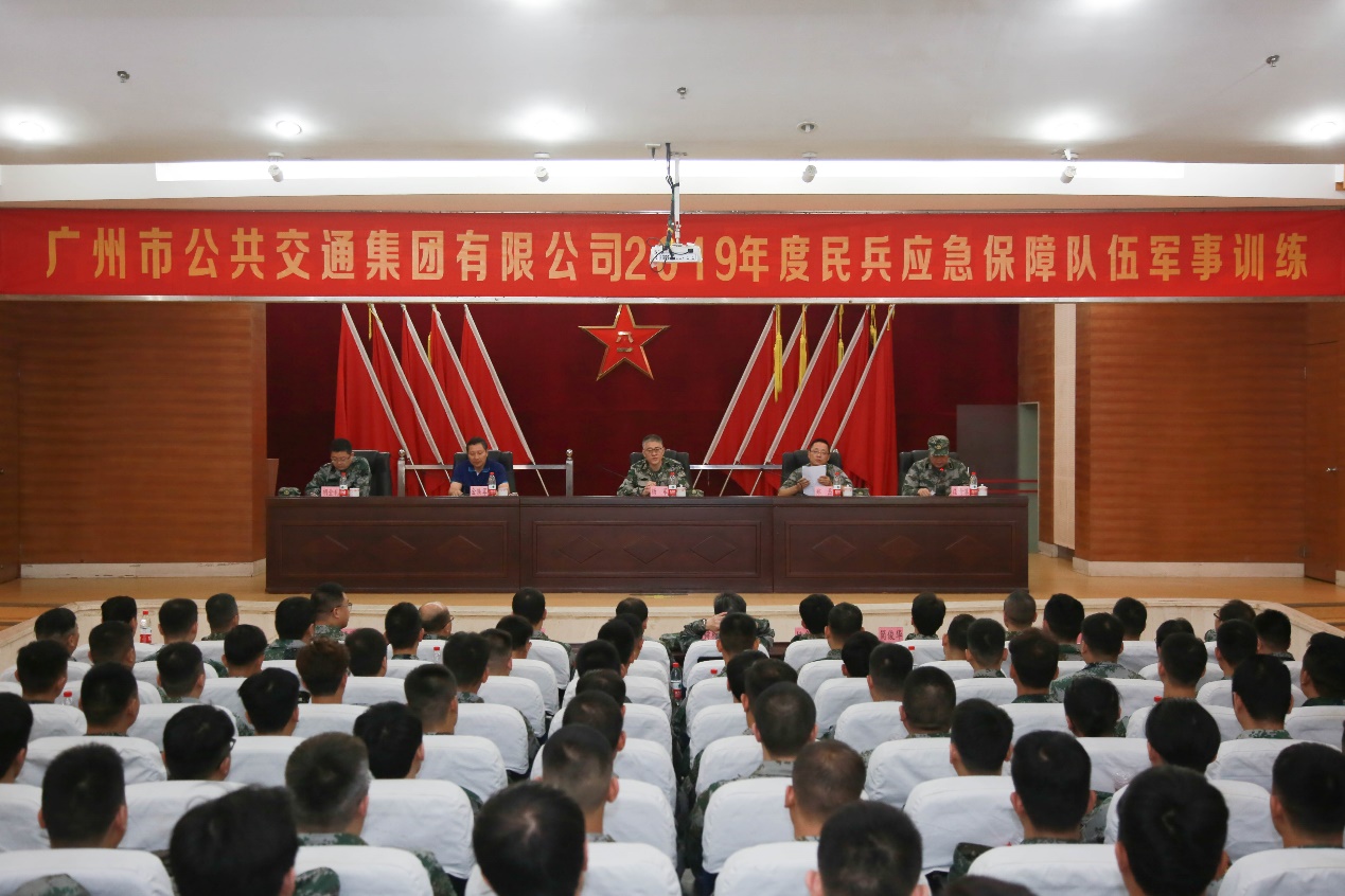 5月26日下午16:00時,廣州市公共交通集團有限公司2019年度民兵應急保障隊伍軍事訓練動員大會在番禺國防教育訓練基地順利舉行。越秀區人武部部長鄭磊上校、交通運輸局戰備處金鐵軍副處長、公交集團臨時黨委副書記楊軍同志、安全總監兼武裝部部長莊清溪同志、黨委工作部部長胡金禮同志及各參訓單位分管武裝工作的領導出席了會議。