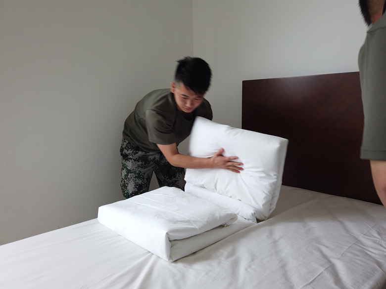 二是整理內務。俗話說“出門看隊列,進門看內務”,可見內務的重要性。整理內務有利于培養嚴整的軍容、自覺而嚴格的組織紀律,鞏固和提高戰斗力。各班的班長組織退伍軍人示范整理宿舍內務,清理地面、整理床鋪、規范物品擺放。新兵同志們最感興趣的是整理床鋪,看到老兵們折疊整齊的床單,仔細認真地學習如何把一張軟綿綿的被子變成一個“正方體”。
